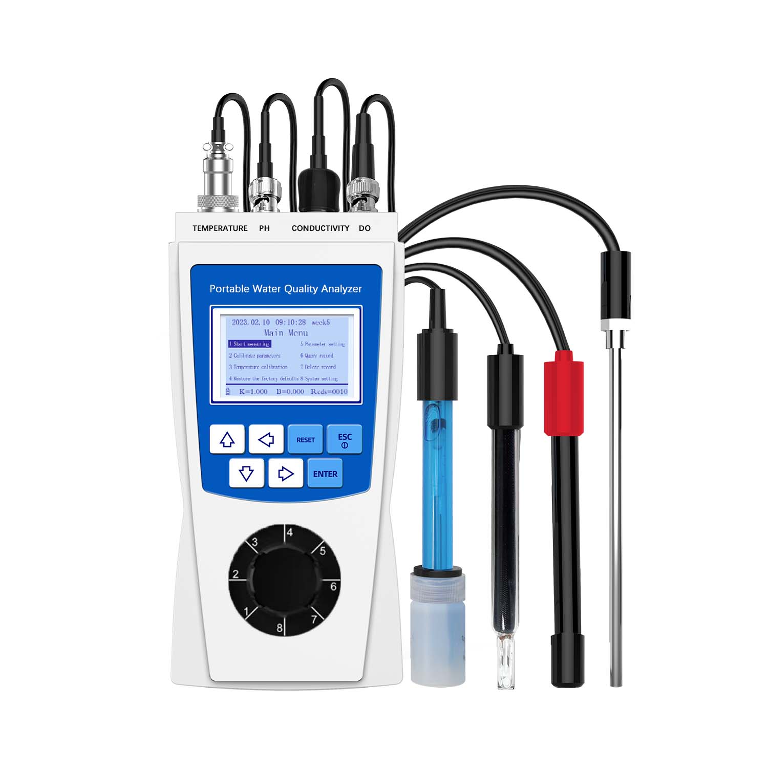 Electrode (configured according to selected parameters): 1 pH composite electrode, 1 conductivity electrode, 1 dissolved oxygen electrode, 1 temperature electrode.