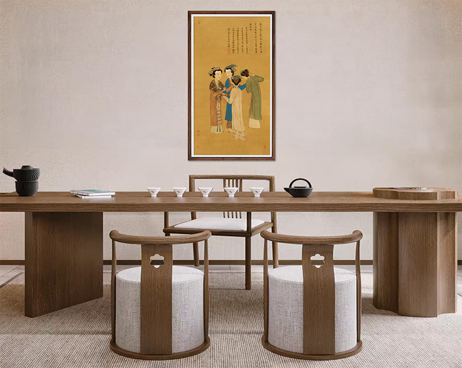 Tang Yin, courtesy name Bo Hu, is renowned as one of the Four Great Talents of the Jiangnan Region. This painting depicts the harem of Wang Yan, the last ruler of Former Shu during the Five Dynasties period.